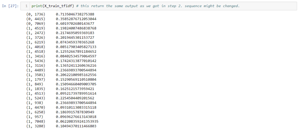 print(X_train_tfidf) # this return the same output as we got in step 2. sequence might be changed.