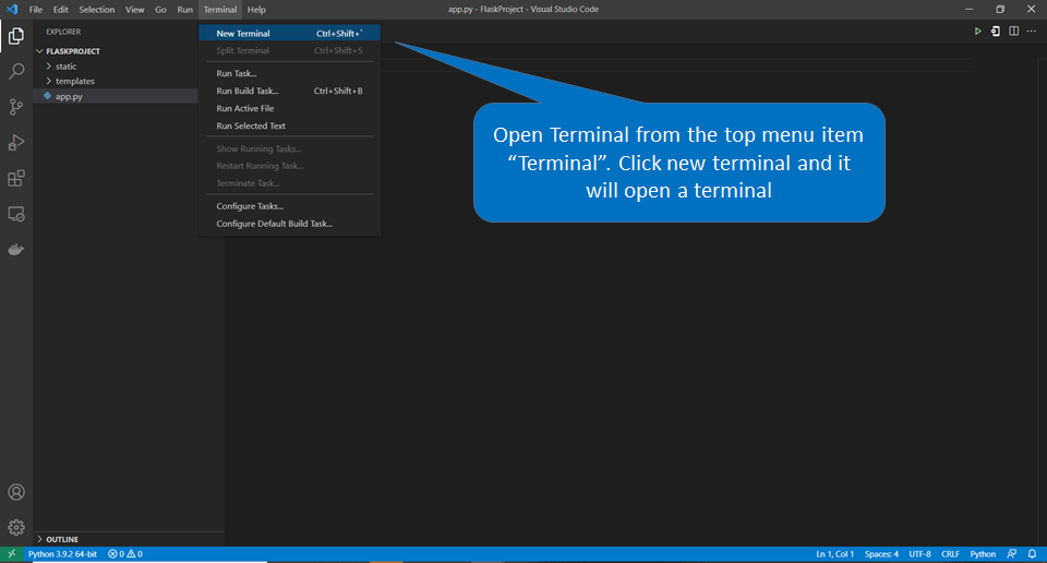you can type VS Code on start menu and then open it. Once it opens, click on the file menu at the top and open the FlaskProject folder we created in previous step.