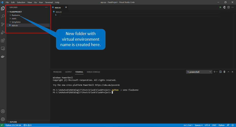 In the terminal make sure you are in the correct folder else use cd command to navigate to the right folder. Then type “python -m venv environmentName” in the terminal and hit enter. It will create virtual environment in the same directory. You can see a new folder with the name of virtual env must be created inside the FlaskProject folder.