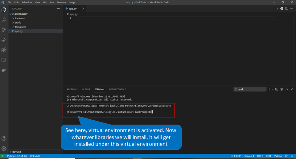 Now Activate the virtual environment using “\yourVenvName\Scripts\Activate” as below: