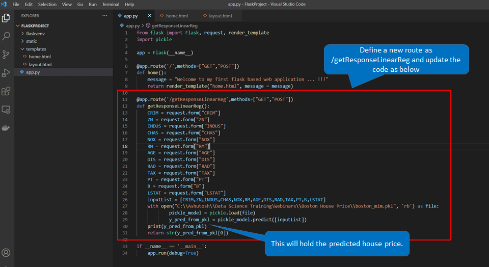 Now HTML page work is done. Next we need to go to the app.py file and load the saved linear regression trained model.