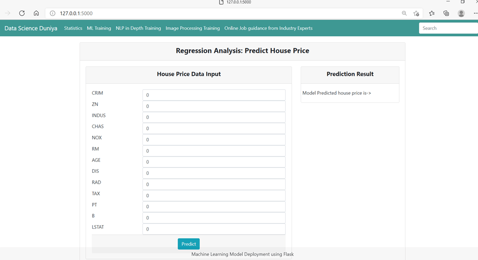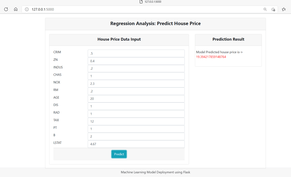 Now run the application using python app.py from the terminal and fill the input form and click predict. You will se the output as below: