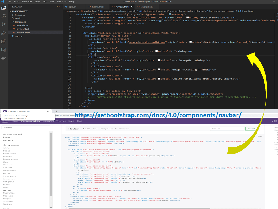 one last thing, we can also have some navbar at the top to complete the user interface. So simply create the navbar.html inside the templates folder and copy paste navbar code from the bootstrap and change the labels and href link accordingly.