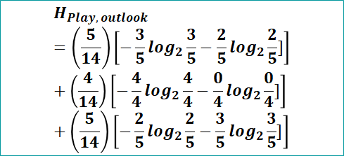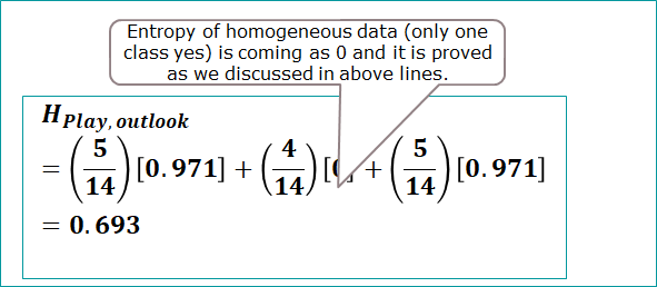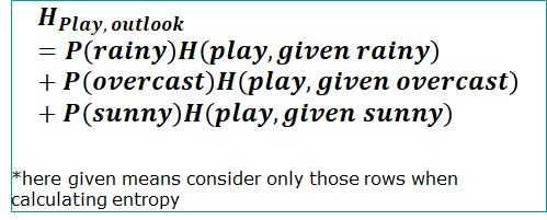 Now to calculate Entropy(Play, given Outlook), will calculate weighted entropy of play individually for rainy, overcast and sunny and then sum them all.