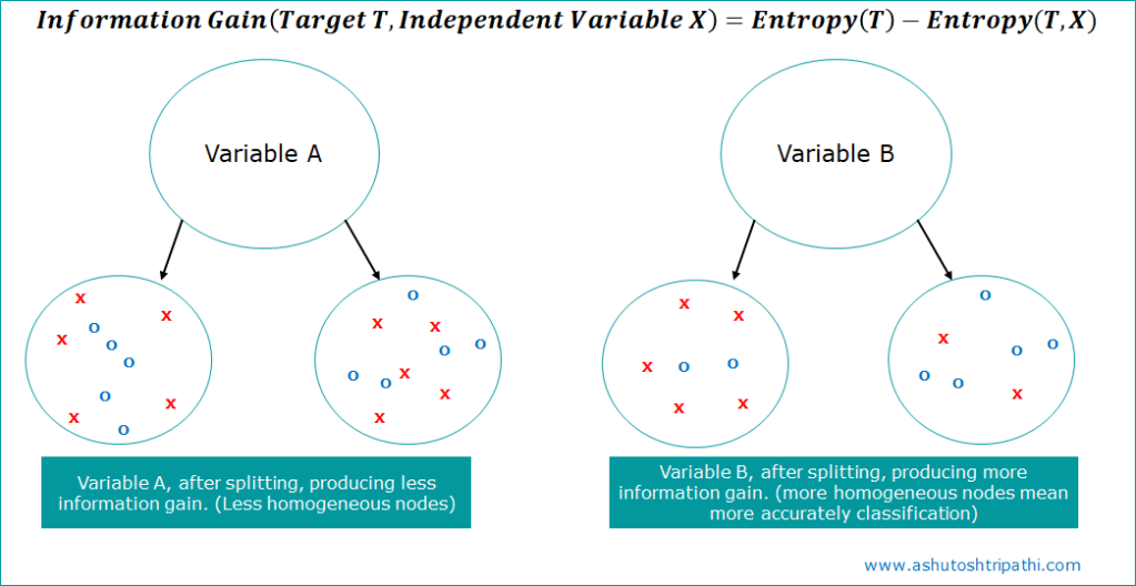 This goes in align with our objective of getting the more homogeneous data node after the split. So we calculate the entropy of target with each independent variable and see where information gain is more means where we getting more homogeneous node. So the variable which has more information gain will be placed at root.