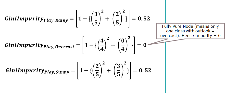 Lets take the football play example data and calculate gini for the outlook column.