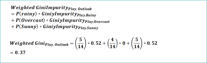 Here also will calculate weighted gini with respect to rainy, overcast and sunny rows and sum them all to get the final gini value for outlook column.